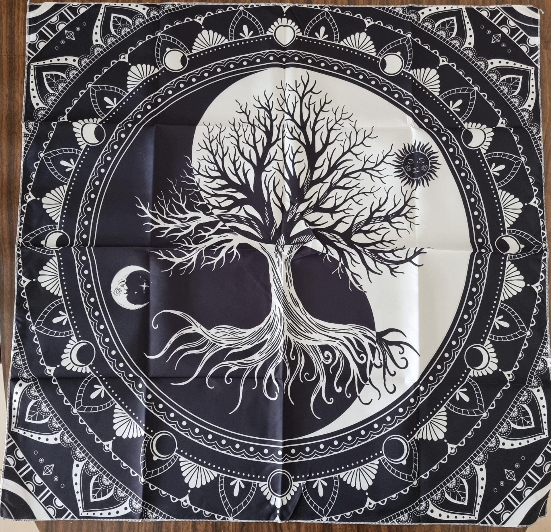 בד יפייפה בצבע שחור לבן עם ציור של עץ החיים.