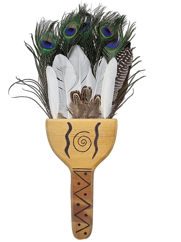 מניפת נוצות לסמאדג'ינג עבודת יד עם ידית עץ מעוטרת בעבודת יד.